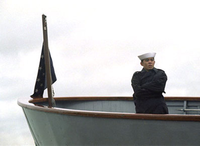 Tom Fernando, a sailor cadet, stands watch on deck on a drizzly Saturday afternoon.
